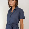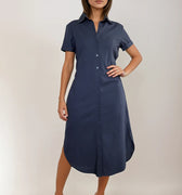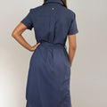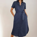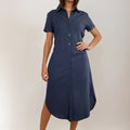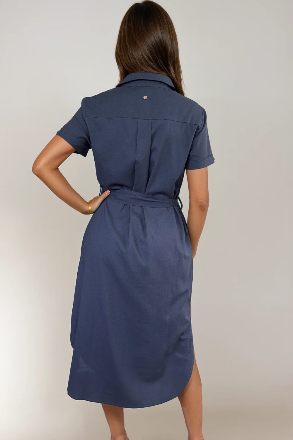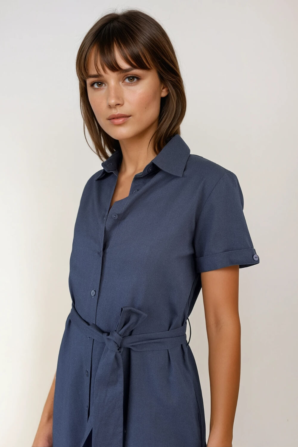 Este vestido camisero clásico y atemporal, está confeccionado en una mezcla de lino y viscosa: una combinación ligera, fresca y suave al tacto, ideal para los días más cálidos. Su diseño de líneas simples y elegantes destaca por el corte recto con caída natural, los botones al frente y el cuello camisero que aporta un toque pulido pero relajado. Las mangas cortas y el lazo ajustable en la cintura permiten adaptarlo a tu silueta, logrando un look femenino y cómodo a la vez. Los bolsillos escondidos le dan un toque casual y ondero, además de ser funcionales. Perfecto para acompañarte desde la oficina hasta una salida de fin de semana. Combínalo con sandalias o zapatillas para un estilo casual, o con accesorios más sofisticados si buscas un aire más elegante. Disponible en verde seco y azul marino, dos colores clásicos y muy fáciles de combinar.