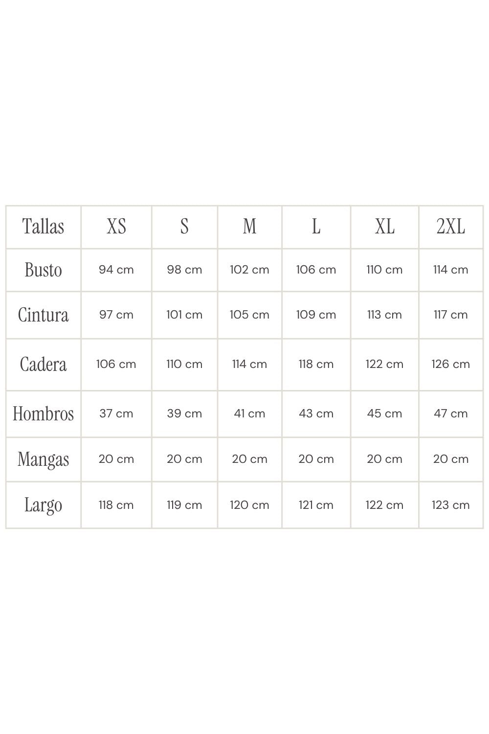 ✨ Consejo para elegir tu talla: Este vestido es de calce clásico. Te aconsejamos que te guíes por las medidas de busto y cintura que son las partes más "entalladas" de la prenda.