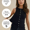 Renueva tus básicos con este top sin mangas confeccionado en modal rib, un tejido suave, elasticado y cómodo que se ajusta al cuerpo sin perder frescura. Su diseño resalta por el detalle de botones delanteros, que recorren la prenda desde el escote hasta el ruedo, dejando una abertura inferior que le da un aire moderno y estilizado. De calce favorecedor y femenino, es una prenda versátil que puedes usar tanto en un look casual con jeans como en un outfit más arreglado con faldas o pantalones de vestir. El escote recto y su terminación sin mangas lo convierten en un básico con un toque diferente, ideal para esta temporada. Diponible en negro, verde y azul, colores fáciles de combinar y perfectos para sumar a tu clóset.