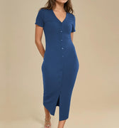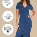 Este vestido midi de modal rib es el equilibrio perfecto entre comodidad y estilo femenino. Su tejido acanalado, suave y elasticado se adapta al cuerpo realzando la silueta de manera natural, mientras que el escote en V con botones a lo largo del frente le da un aire elegante y moderno. El diseño incluye mangas cortas que aportan frescura y practicidad, y una abertura frontal que entrega movimiento y un toque sensual sin perder la sobriedad del corte. Versátil y fácil de combinar, puedes llevarlo con zapatillas para un look relajado de día o con sandalias y accesorios para ocasiones más especiales. Disponible en negro y azul, dos colores clásicos y sofisticados que nunca pasan de moda. Un vestido atemporal que te acompañará en múltiples ocasiones, convirtiéndose en un esencial de tu clóset.
