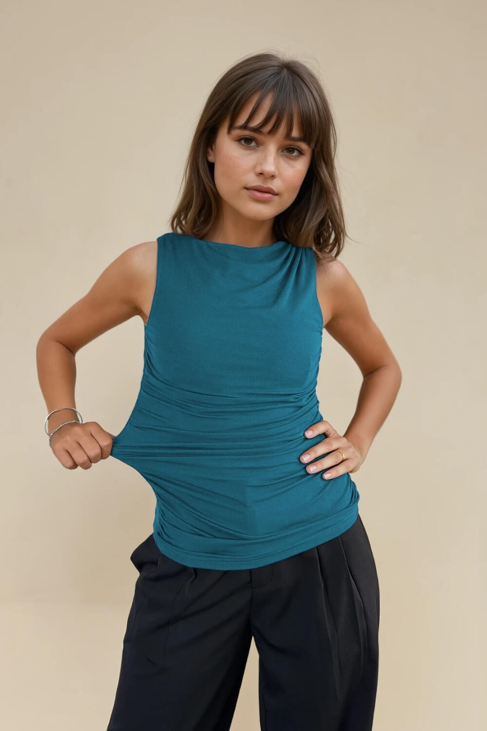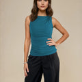Un básico con un toque sofisticado que marca la diferencia. Este top sin mangas está confeccionado en modal suave y elástico, lo que asegura un calce cómodo y favorecedor. Su detalle drapeado en la parte frontal le da un aire elegante y femenino, perfecto para elevar tus looks del día a día o para ocasiones más especiales. El diseño ajustado realza la silueta, mientras que el efecto drapeado aporta movimiento y un acabado moderno que nunca pasa desapercibido. Es una prenda versátil que combina fácilmente con jeans, pantalones o faldas, adaptándose a distintos estilos y momentos. Un must-have para tu clóset en cualquiera de sus colores disponibles, ideal para quienes buscan una prenda simple pero con carácter, que se transforme en la protagonista de cualquier outfit.
