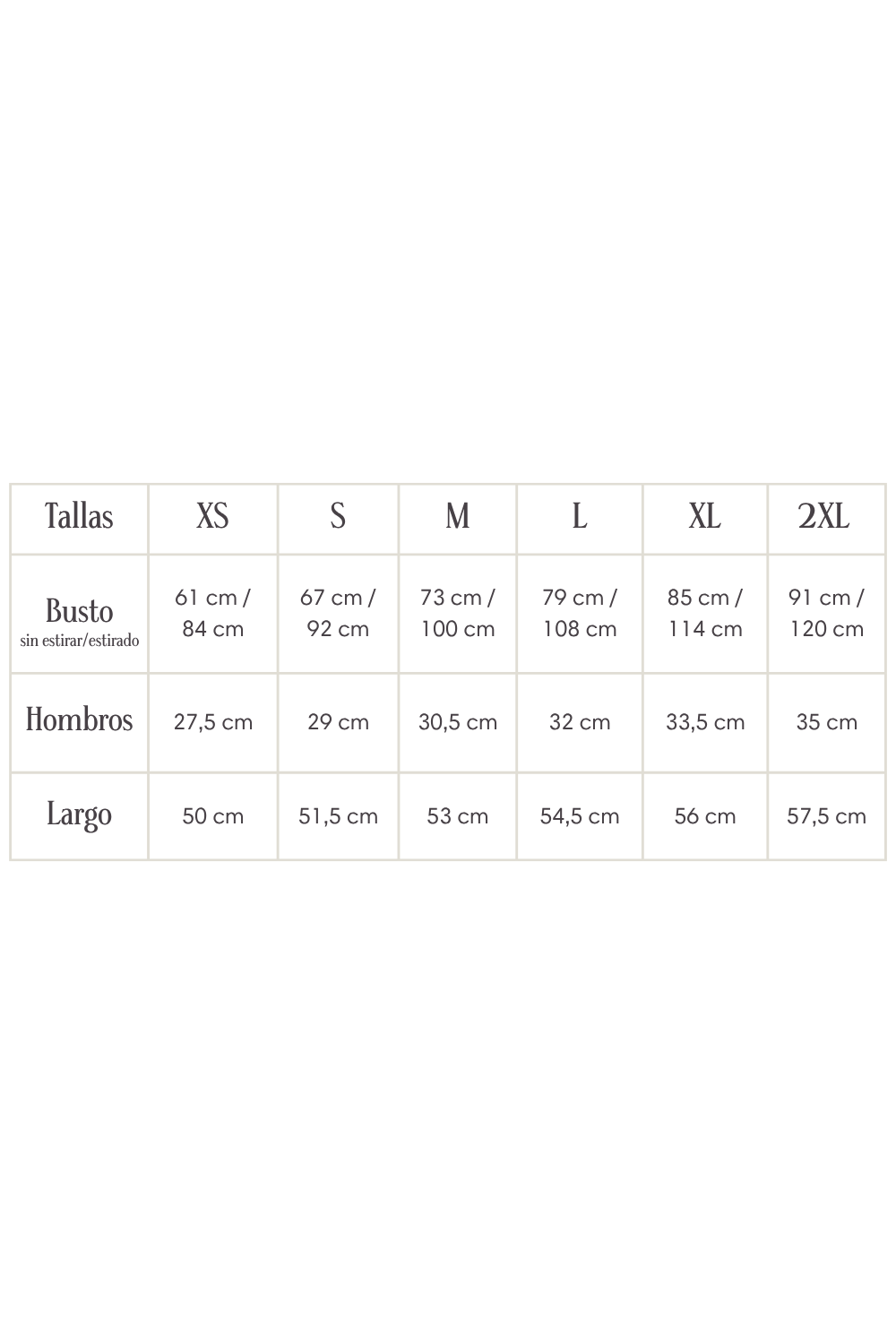 ✨ Consejo para elegir tu talla: Esta polera se adapta a la silueta. Te aconsejamos que te guíes por la medida de busto es la parte más "entallada" del top. Ten en cuenta que esta prenda está confeccionada con modal, por lo tanto es elasticada y cede varios centímetros, como podrás ver en la tabla de talles. Nuestras tallas son más amplias de lo normal, ya que la idea es que las prendas sean cómodas y sueltas.