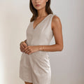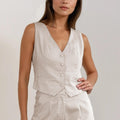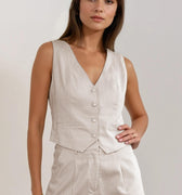 Nuestro tan amado top sastrero Gillette sin mangas es una prenda versátil y elegante que aporta un aire sofisticado a cualquier look. Confeccionado en una mezcla de lino y viscosa, ofrece una caída liviana y fresca, ideal para la temporada. Su diseño presenta un escote en V profundo, cierre con botones forrados al frente y un corte entallado que realza la figura, manteniendo una silueta estilizada y moderna. El ruedo con leve terminación en punta aporta un detalle sutil y distintivo que eleva la prenda. Perfecto para combinar con pantalones de tiro alto, faldas o short haciendo juego, puedes usarlo tanto en un look de oficina como en una salida más casual con blazer encima. Disponible en verde seco, azul, crudo y negro, tonos atemporales que suman estilo y sofisticación a tu clóset.