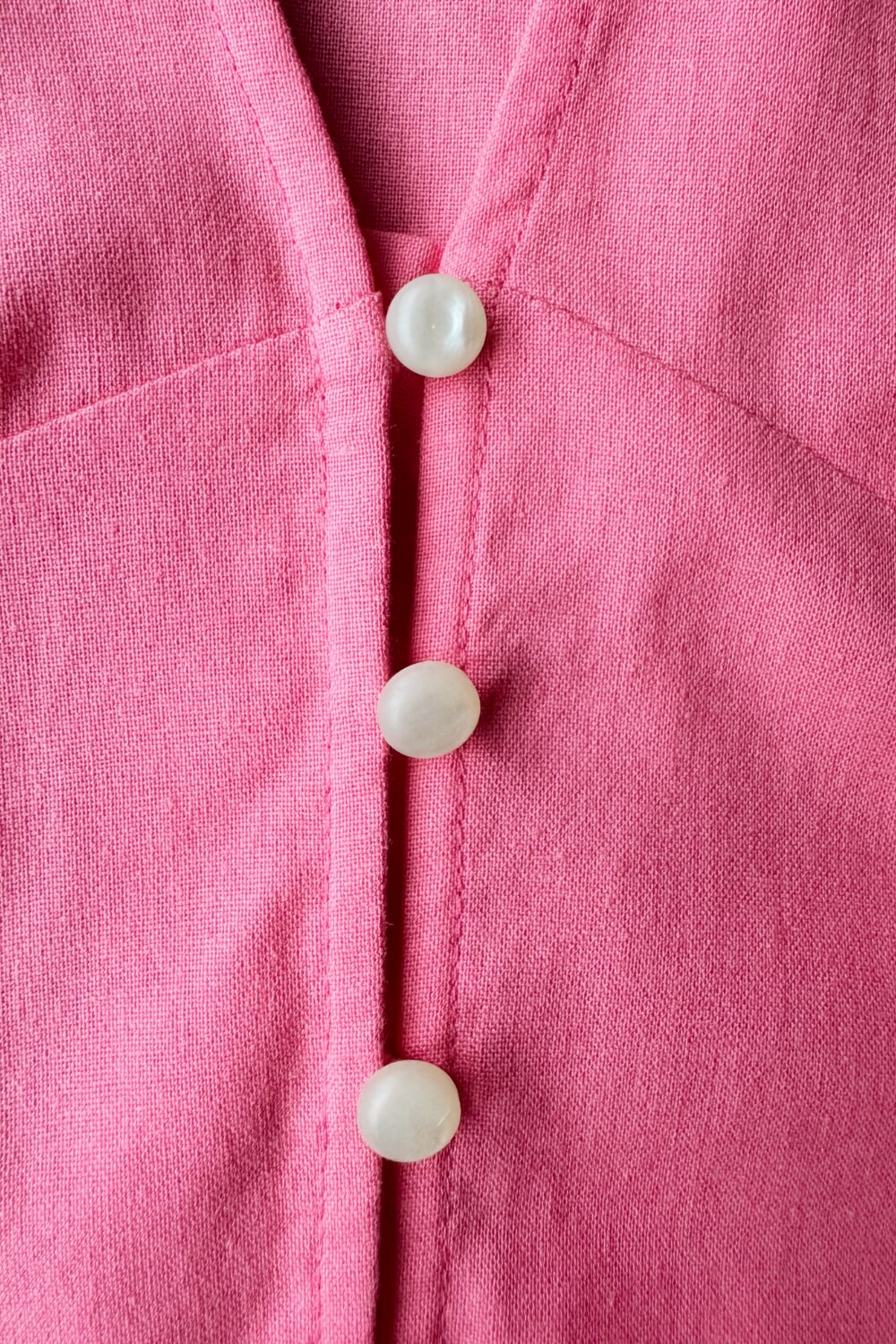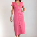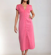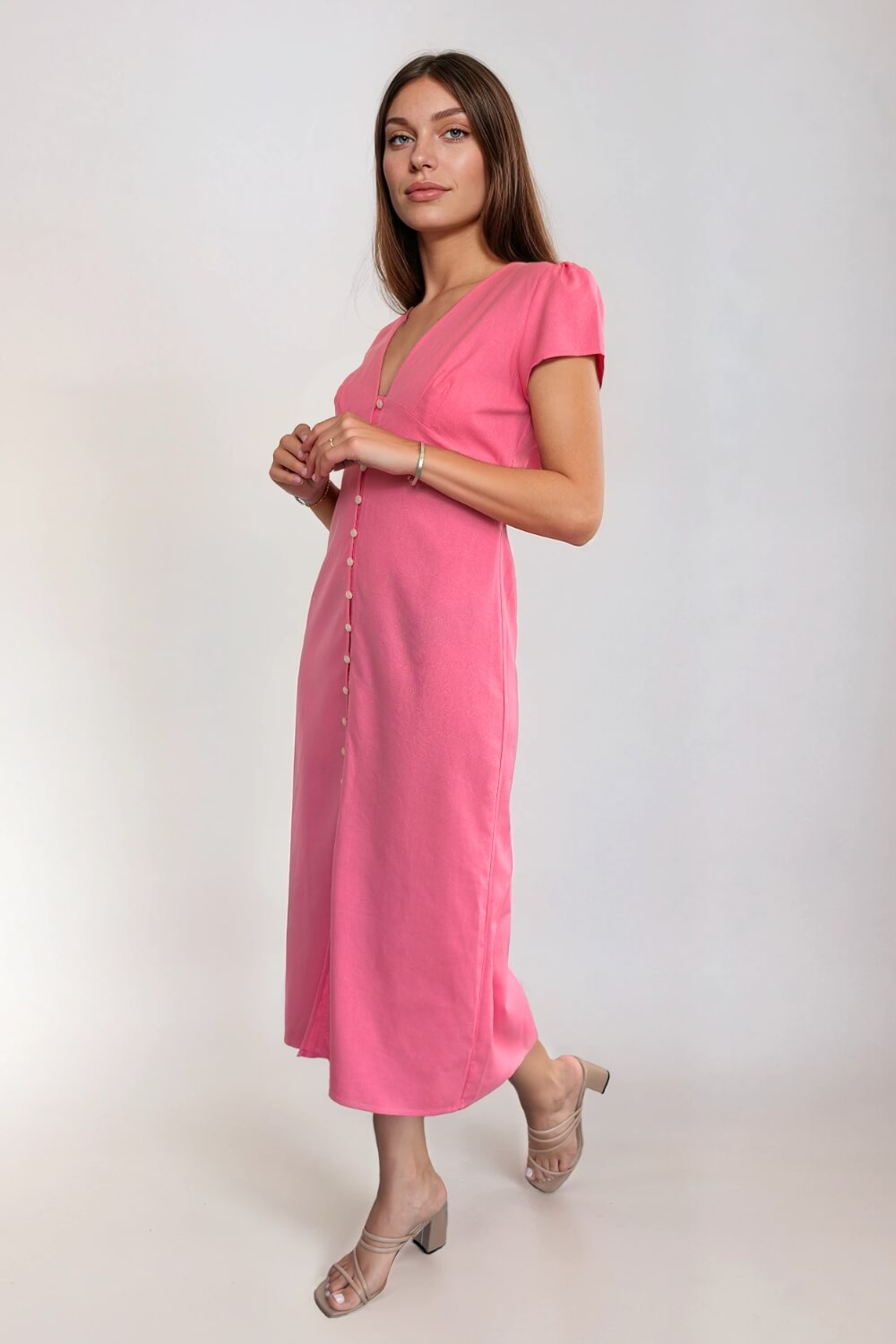 Fresco, femenino y con un aire romántico que encanta. Este vestido corto es ideal para los días en que quieres verte arreglada sin perder comodidad. Su diseño con escote en “V” abotonado al frente aporta un toque delicado y atemporal, mientras que el detalle de pinzas en el pecho y la cintura asegura un calce perfecto, realzando la silueta de forma natural. Con mangas cortas y falda ligeramente evasé, ofrece movimiento y soltura, convirtiéndose en una opción perfecta tanto para un paseo al aire libre como para una ocasión más especial. El tono rosa vibrante ilumina el look y transmite energía, mientras que la versión en blanco resalta por su frescura y versatilidad. Combínalo con sandalias o zapatillas para un look relajado, o con zapatos altos si quieres elevar tu outfit. Un vestido que combina simpleza, estilo y ese toque femenino que nunca pasa de moda.