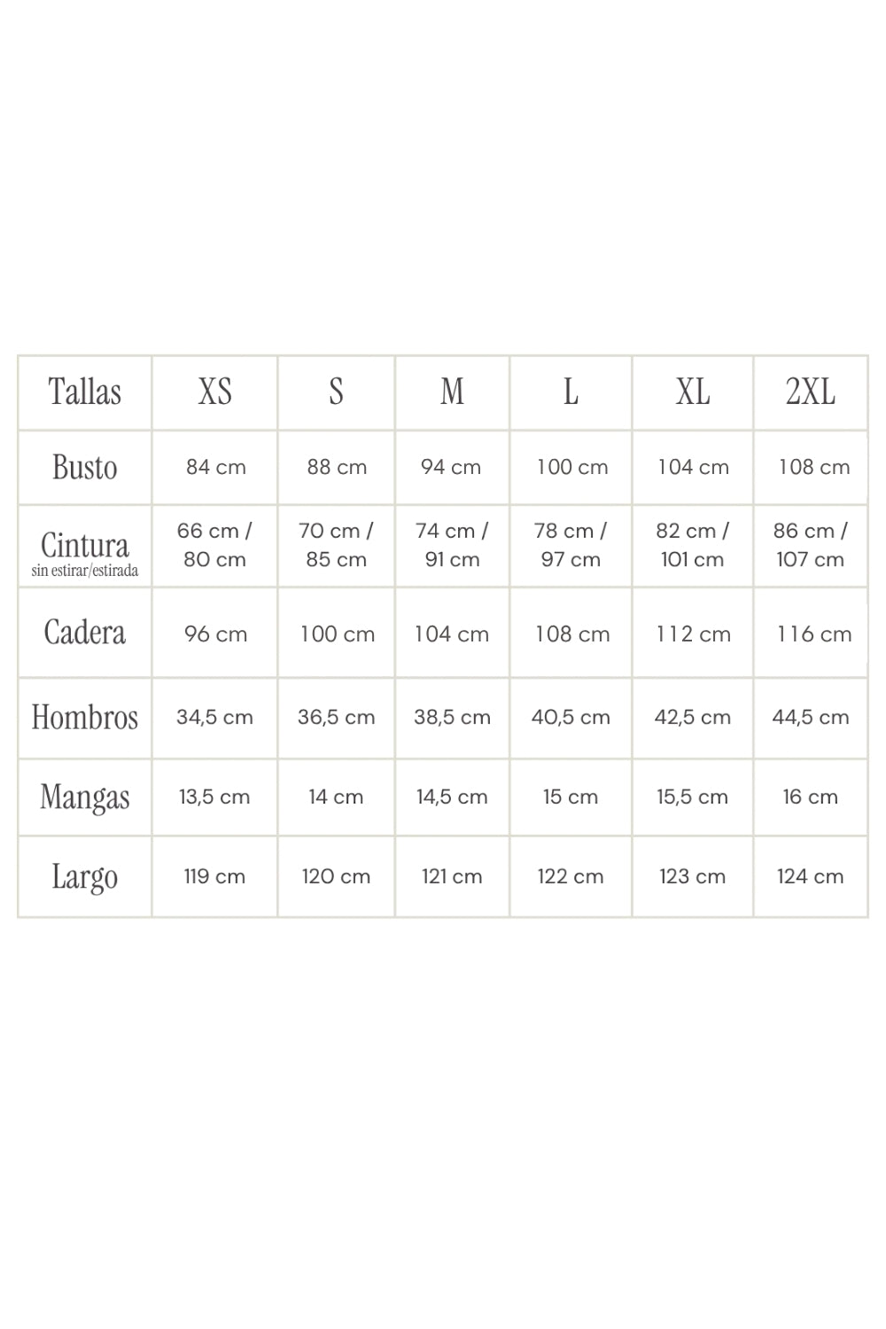 ✨ Consejo para elegir tu talla: Este vestido es de calce clásico. Te aconsejamos que te guíes por las medidas de busto y cintura que son las partes más "entalladas" de la prenda.