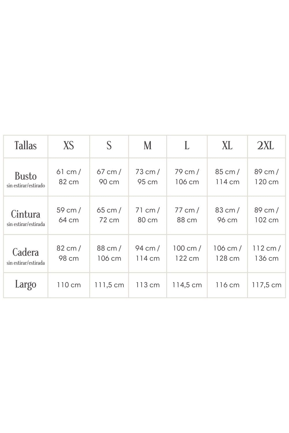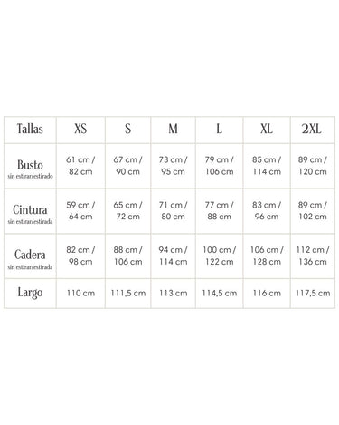 ✨ Consejo para elegir tu talla: Este vestido se adapta a la silueta. Te aconsejamos que te guíes por las medidas de bustos y cadera que son las partes más "entalladas" de la prenda. Ten en cuenta que esta prenda está confeccionada con modal, por lo tanto es elasticada y cede varios centímetros, como podrás ver en la tabla de talles. Nuestras tallas son más amplias de lo normal, ya que la idea es que las prendas sean cómodas y sueltas.