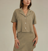Camisa crop de calce holgado y mangas cortas caídas. Cuenta además con cuello doble solapa, para mayor escote. Una camisa básica pero con una silueta moderna que no puede faltar en ningún armario, confeccionada en lino y viscosa. Fresca y versátil, la amarás en todas sus variantes de color.