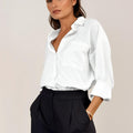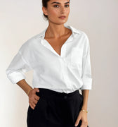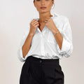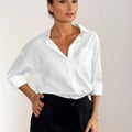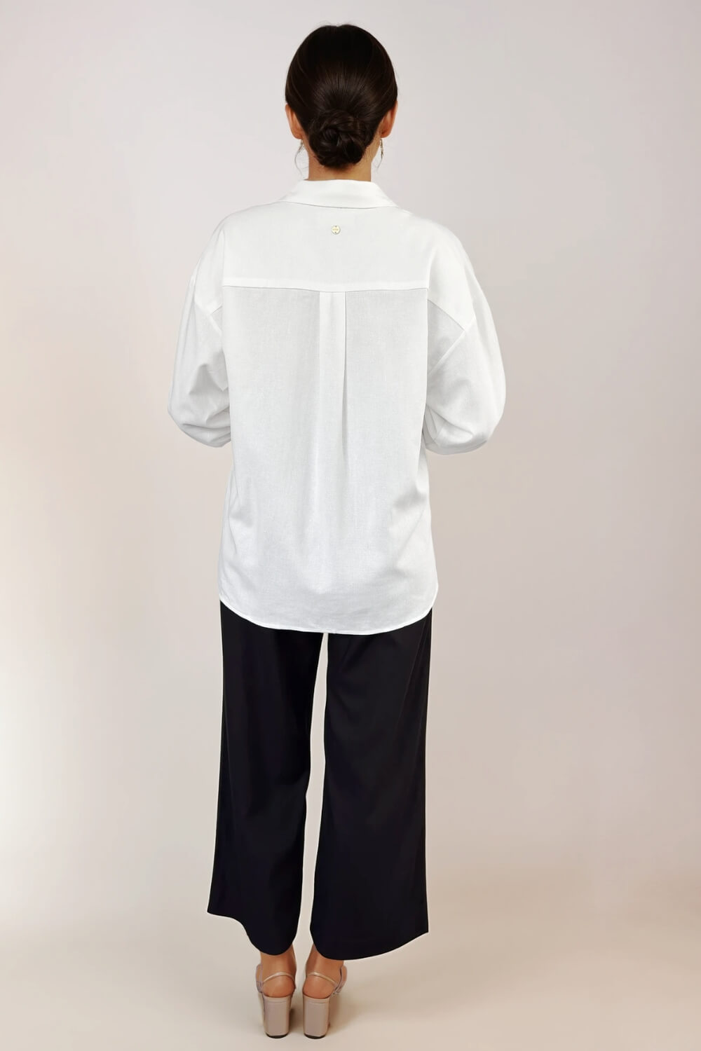 Confeccionada en una mezcla liviana y fresca de lino y viscosa, esta camisa ofrece una caída suave y un tacto muy agradable, perfecta para usar tanto dentro como fuera del pantalón. Disponible en blanco y verde seco, dos tonos versátiles que combinan con todo tu clóset. Un básico imprescindible que no pasa de moda y que podrás usar durante todo el año, ya sea con jeans, pantalones sastreros o faldas.