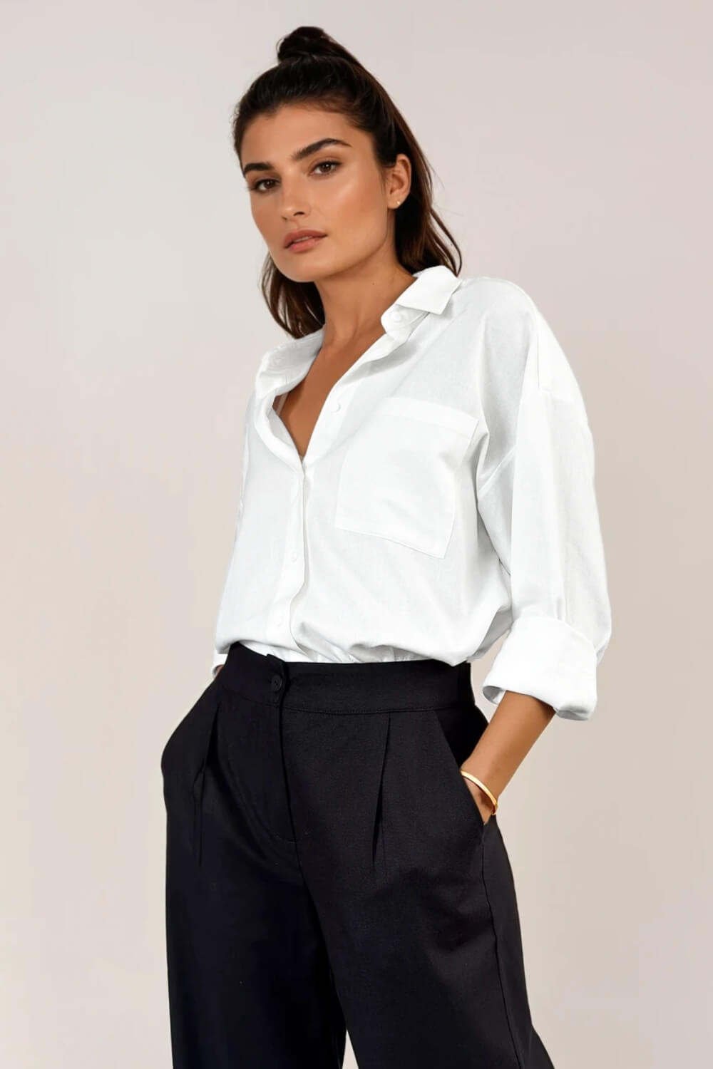 Camisa de lino y viscosa de calce relajado, ideal para acompañarte en cualquier ocasión. Su diseño clásico con cuello camisero y botones al frente se combina con un bolsillo en el pecho que aporta un toque casual y funcional. Las mangas largas con opción de arremangar te permiten adaptarla fácilmente a distintos estilos y temperaturas.