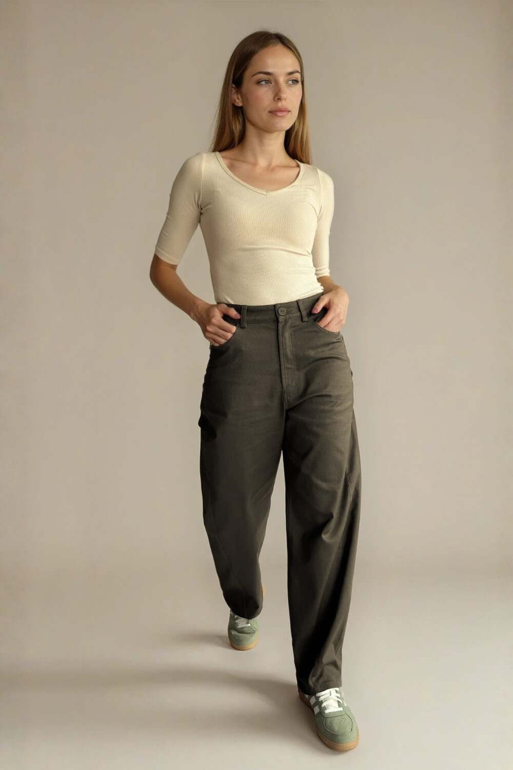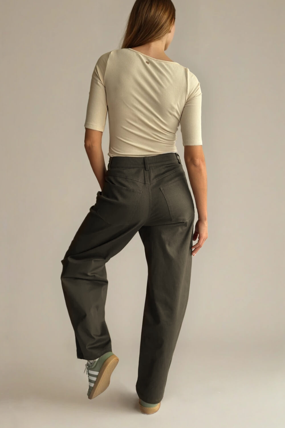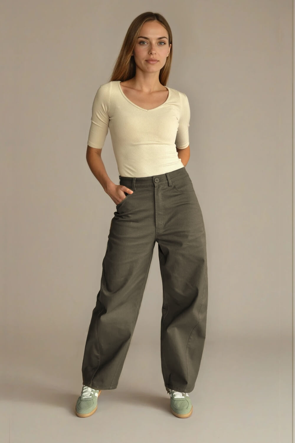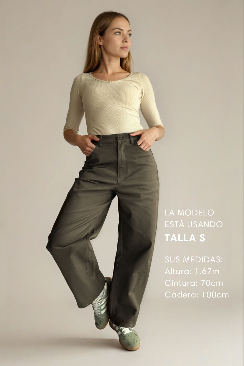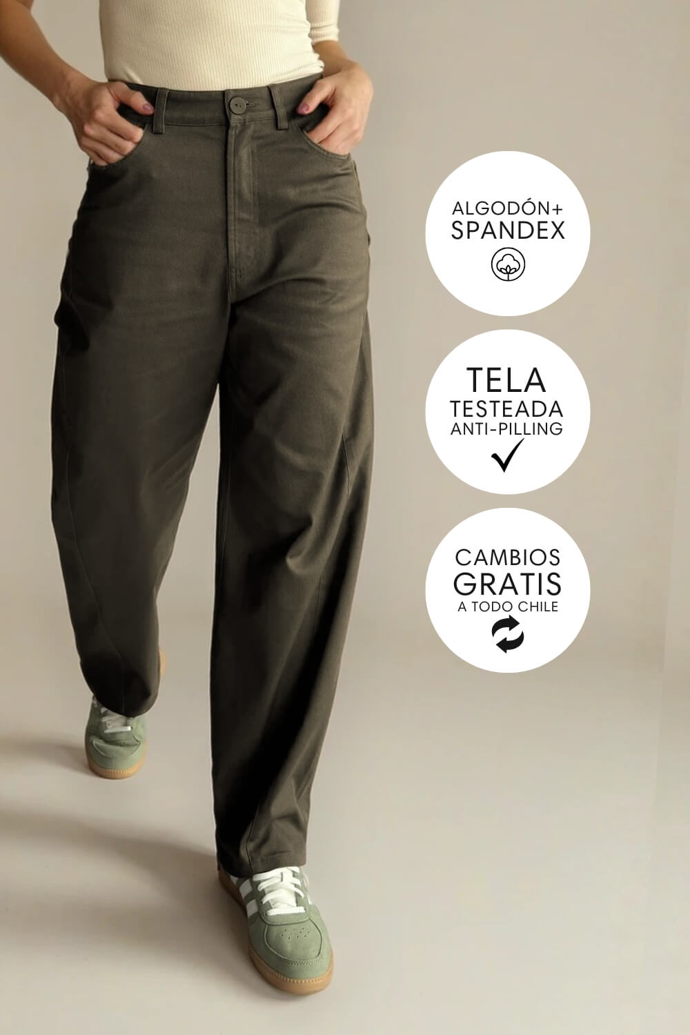 Confeccionado en algodón con spandex, tiene una textura firme pero suave al tacto, con la elasticidad justa para acompañarte en cada movimiento sin perder su estructura. Es una tela cómoda, resistente y pensada para el uso diario. Su diseño barrel —más amplio en la cadera y ligeramente ajustado hacia el tobillo— crea una silueta moderna y muy favorecedora, aportando estilo sin esfuerzo. Tiene pretina con presillas, cierre frontal y bolsillos funcionales que mantienen ese aire casual y versátil que tanto nos gusta.
