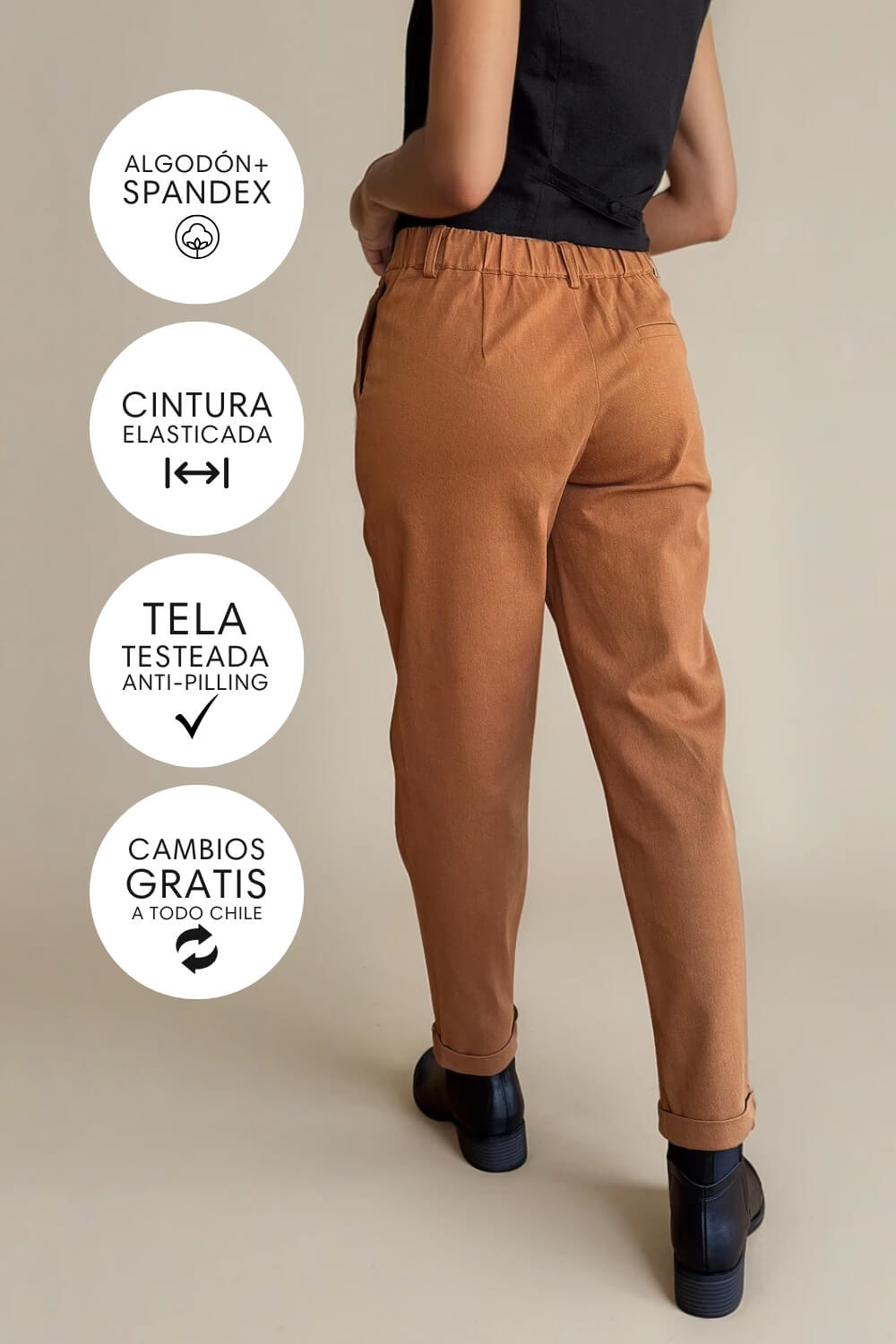 Material: Gabardina de 98% Algodón y 2% Spandex. 280grs. Una tela de fibras naturales, elasticada y grosor medio, ideal para pantalones de medio tiempo e invierno.