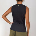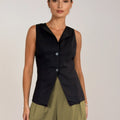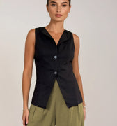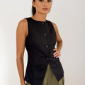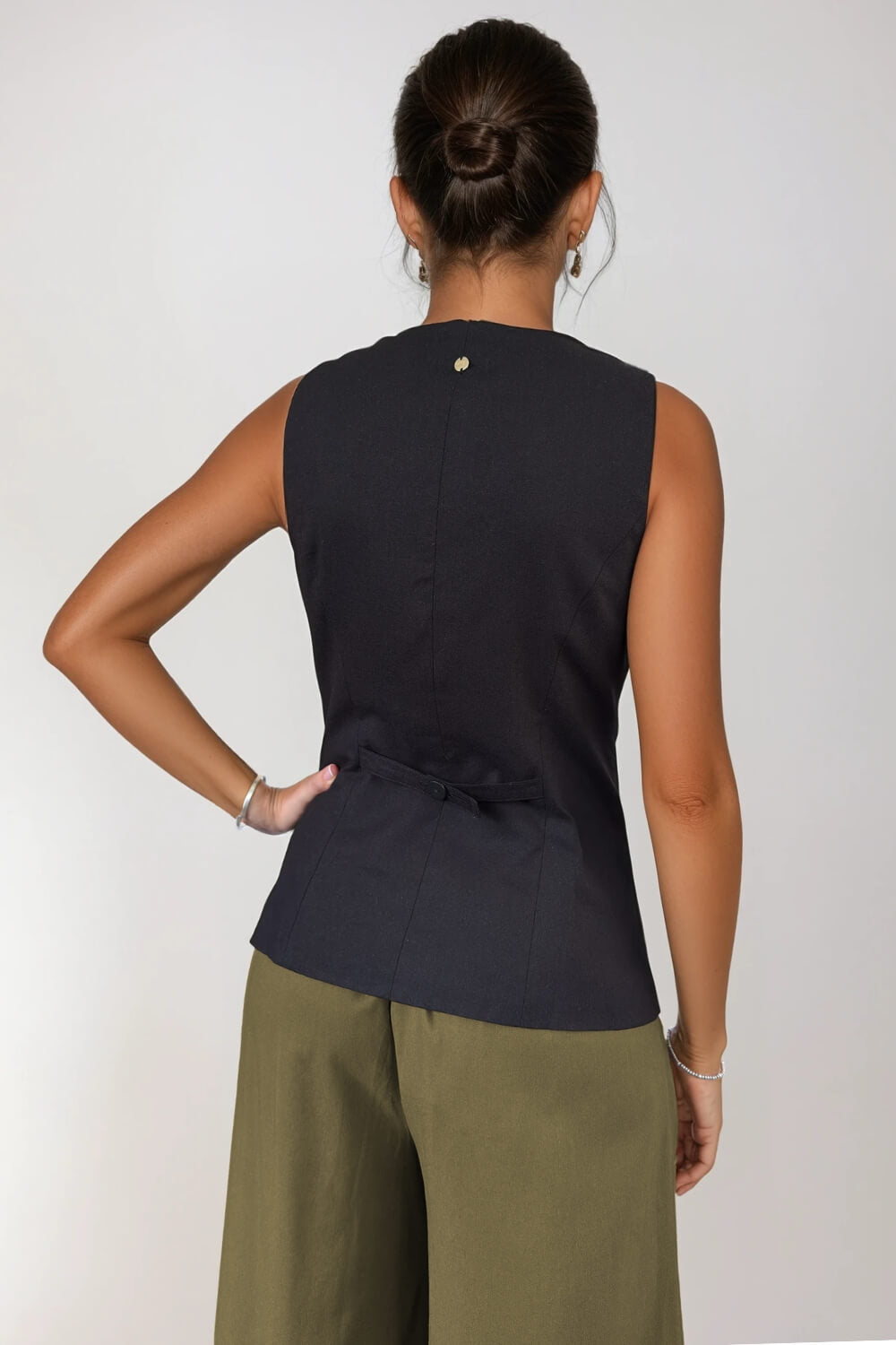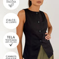 Este top sin mangas es una prenda que combina elegancia y frescura, perfecta para looks de media estación o para elevar tus outfits veraniegos. Confeccionado en una mezcla de lino y viscosa, su textura liviana y suave al tacto entrega una caída natural que realza la figura con sutileza. Su diseño presenta una silueta entallada, con botones frontales y bolsillos tipo ojal que aportan un toque moderno y sofisticado. En la parte trasera, incorpora una delicada presilla ajustable que permite definir la cintura y resalta el calce femenino.