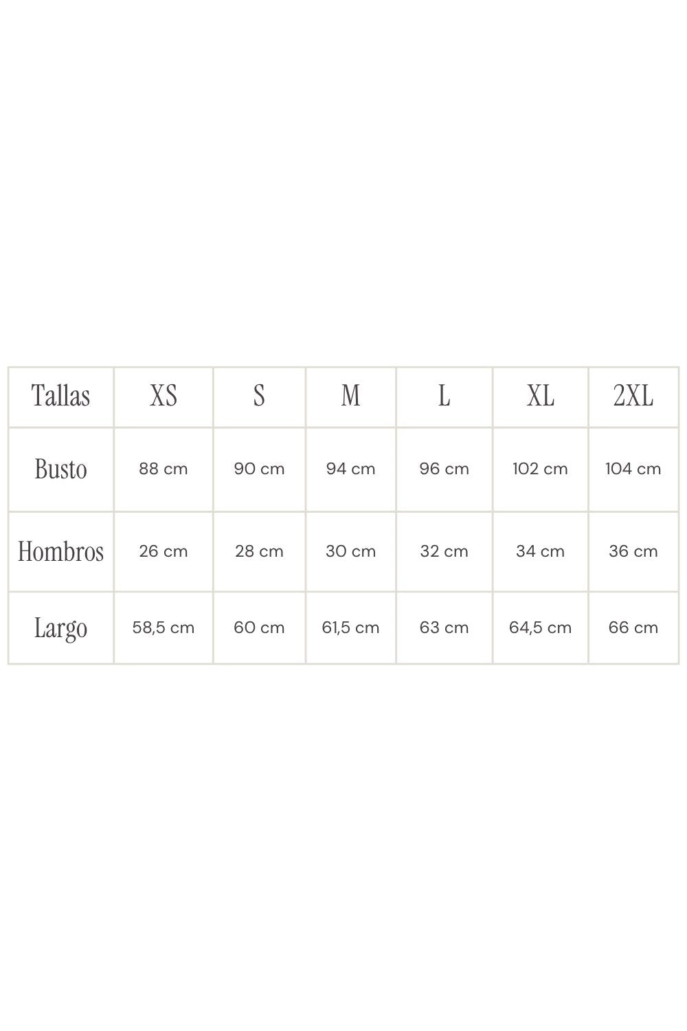 ✨ Consejo para elegir tu talla: Este top es de calce clásico. Te aconsejamos que te guíes por la medida de busto que es la parte más "entallada" de la prenda.