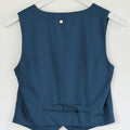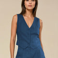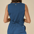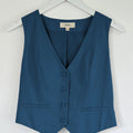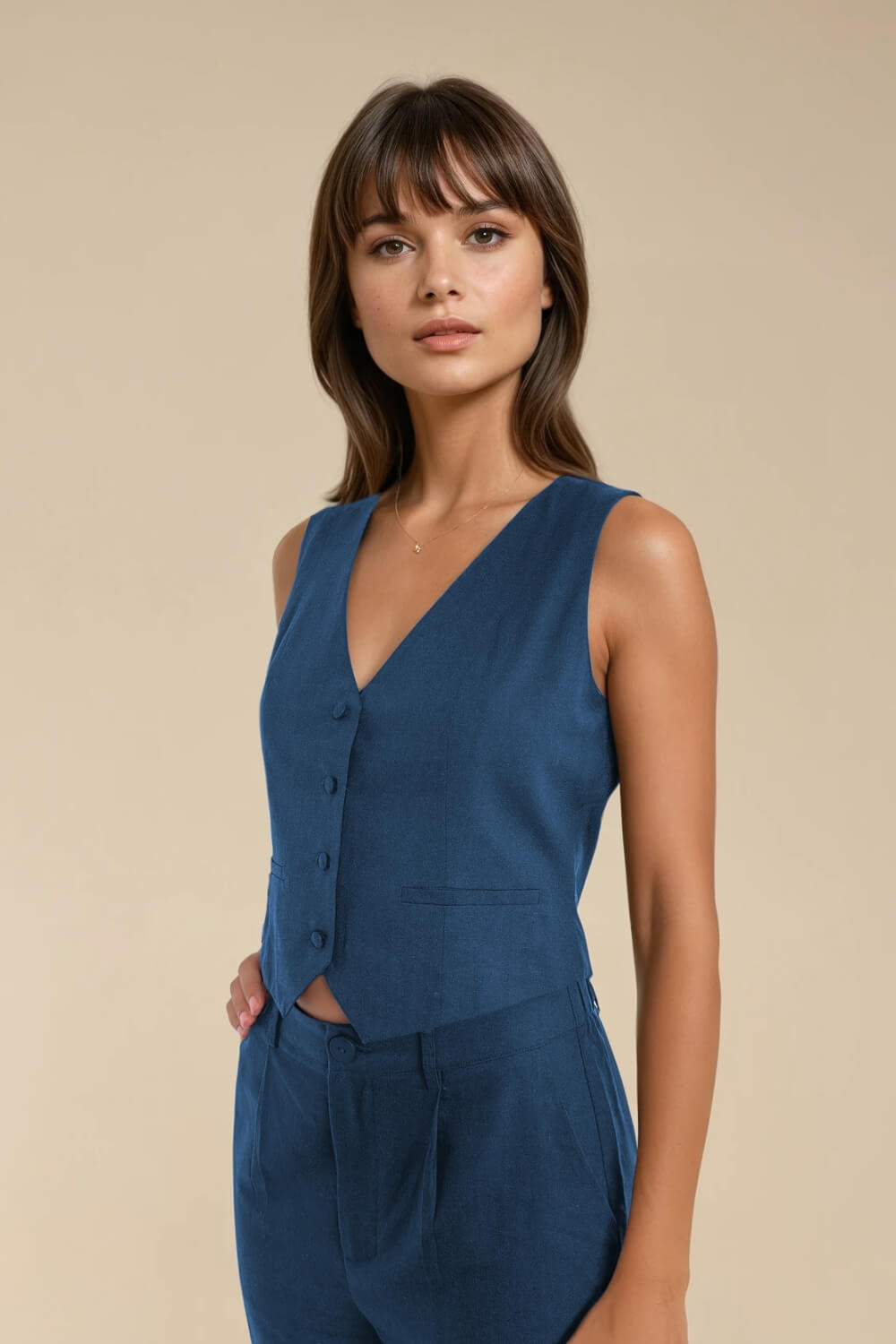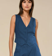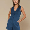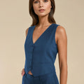 Nuestro tan amado top sastrero Gillette sin mangas es una prenda versátil y elegante que aporta un aire sofisticado a cualquier look. Confeccionado en una mezcla de lino y viscosa, ofrece una caída liviana y fresca, ideal para la temporada. Su diseño presenta un escote en V profundo, cierre con botones forrados al frente y un corte entallado que realza la figura, manteniendo una silueta estilizada y moderna. El ruedo con leve terminación en punta aporta un detalle sutil y distintivo que eleva la prenda. Perfecto para combinar con pantalones de tiro alto, faldas o short haciendo juego, puedes usarlo tanto en un look de oficina como en una salida más casual con blazer encima. Disponible en verde seco y azul, dos tonos atemporales que suman estilo y sofisticación a tu clóset.