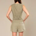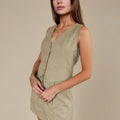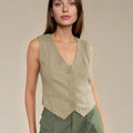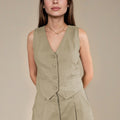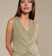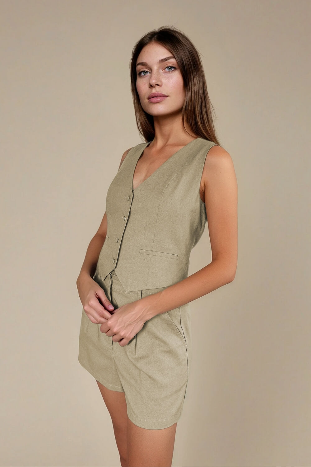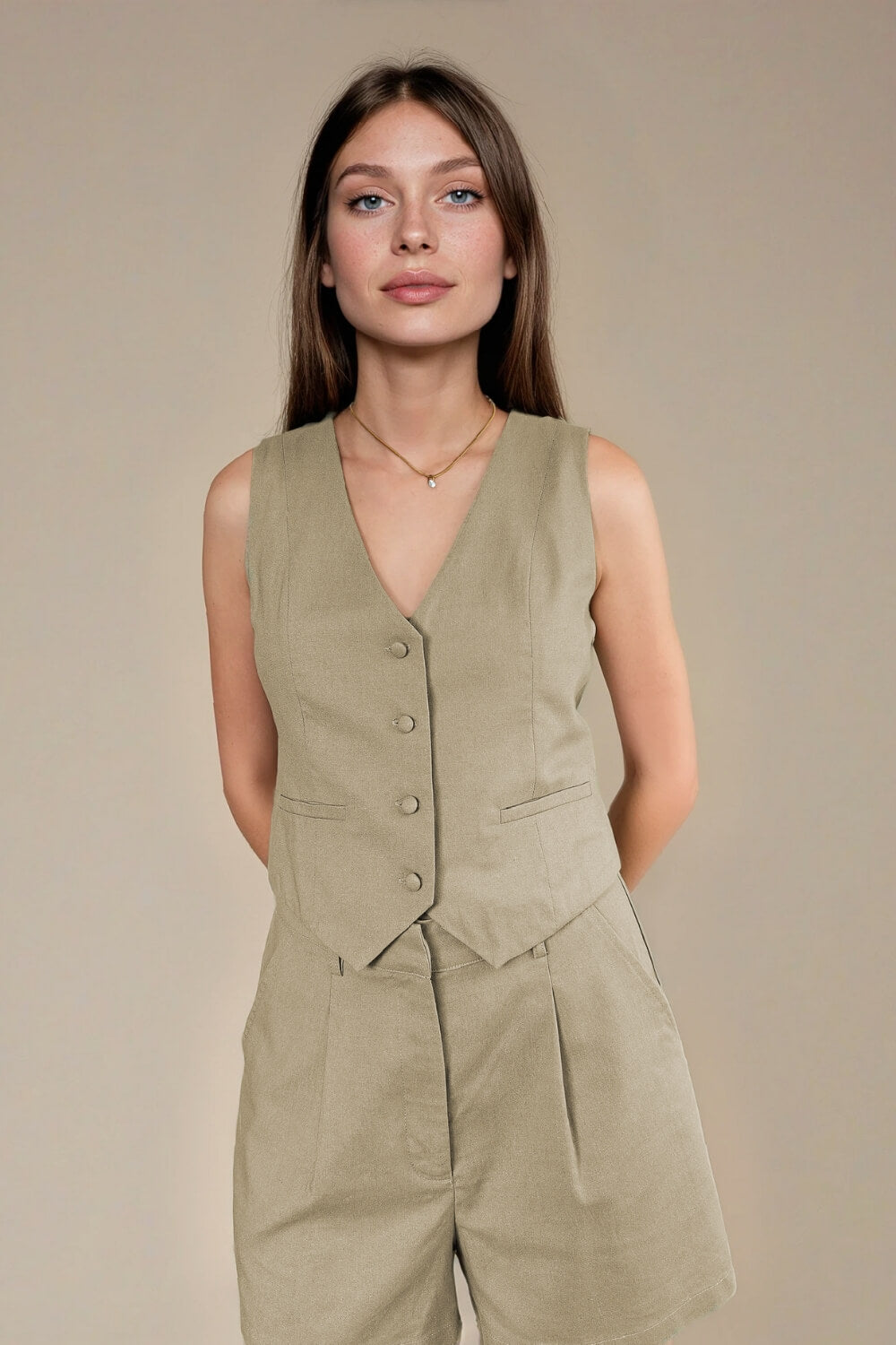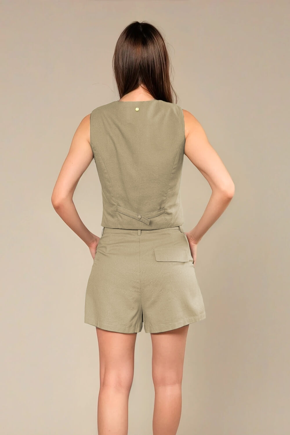 Nuestro tan amado top sastrero Gillette sin mangas es una prenda versátil y elegante que aporta un aire sofisticado a cualquier look. Confeccionado en una mezcla de lino y viscosa, ofrece una caída liviana y fresca, ideal para la temporada. Su diseño presenta un escote en V profundo, cierre con botones forrados al frente y un corte entallado que realza la figura, manteniendo una silueta estilizada y moderna. El ruedo con leve terminación en punta aporta un detalle sutil y distintivo que eleva la prenda. Perfecto para combinar con pantalones de tiro alto, faldas o short haciendo juego, puedes usarlo tanto en un look de oficina como en una salida más casual con blazer encima. Disponible en verde seco y azul, dos tonos atemporales que suman estilo y sofisticación a tu clóset.