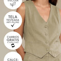 Material: 55% Viscosa, 45% Lino - Una tela delgada sin elasticidad, muy fresca, liviana y agradable al tacto. Ideal para prendas de verano clásicas de estilo sastreras.