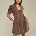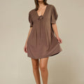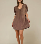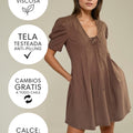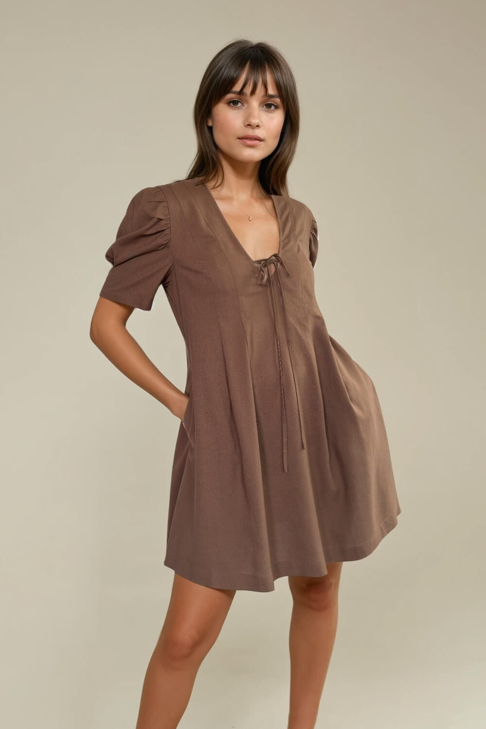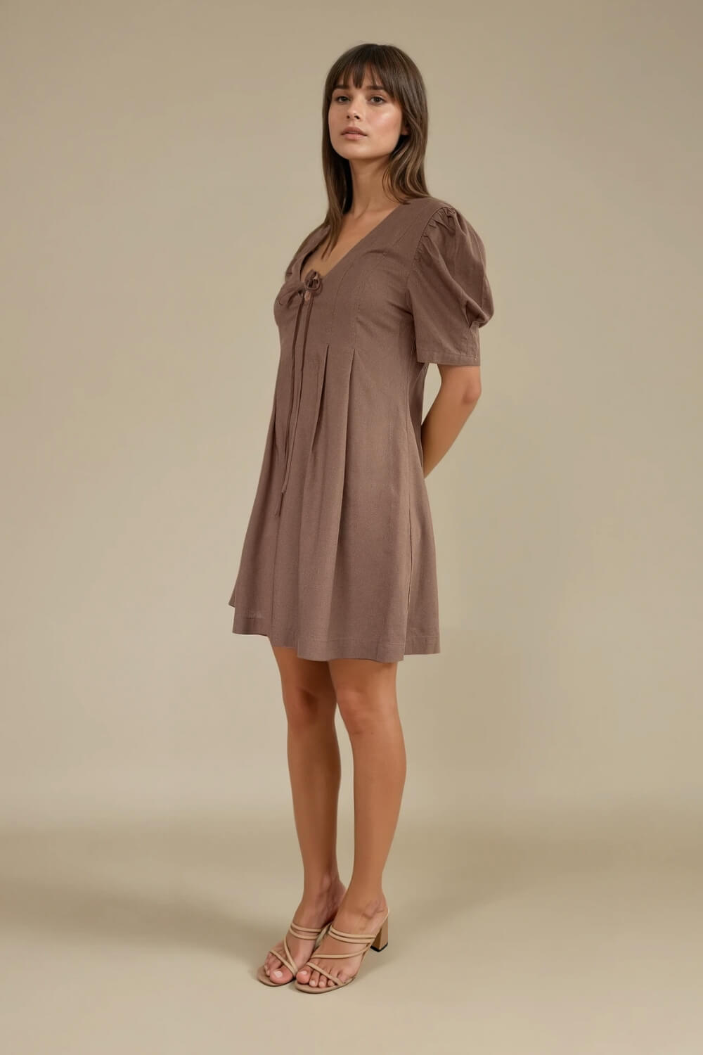 Un vestido pensado para acompañarte en tus días de verano con frescura y estilo. Está confeccionado en una mezcla de lino y viscosa que se siente ligera al tacto y deja que la piel respire, ideal para los días soleados. Su diseño destaca por el escote en V con un delicado lazo que se anuda al frente, aportando un toque romántico y femenino. Las mangas cortas abullonadas suman un aire sutilmente vintage, mientras que las pinzas delanteras y traseras ayudan a dar forma y estilizar la figura sin perder comodidad. El cierre invisible en la espalda mantiene la prenda pulida y elegante, pensada para que se vea impecable desde cualquier ángulo. Es un vestido versátil: puedes llevarlo con sandalias planas para un look relajado de día, o con zapatos más formales para la noche. Disponible en mocha y borgoña, dos colores vibrantes perfectos para sumar color a tu clóset.