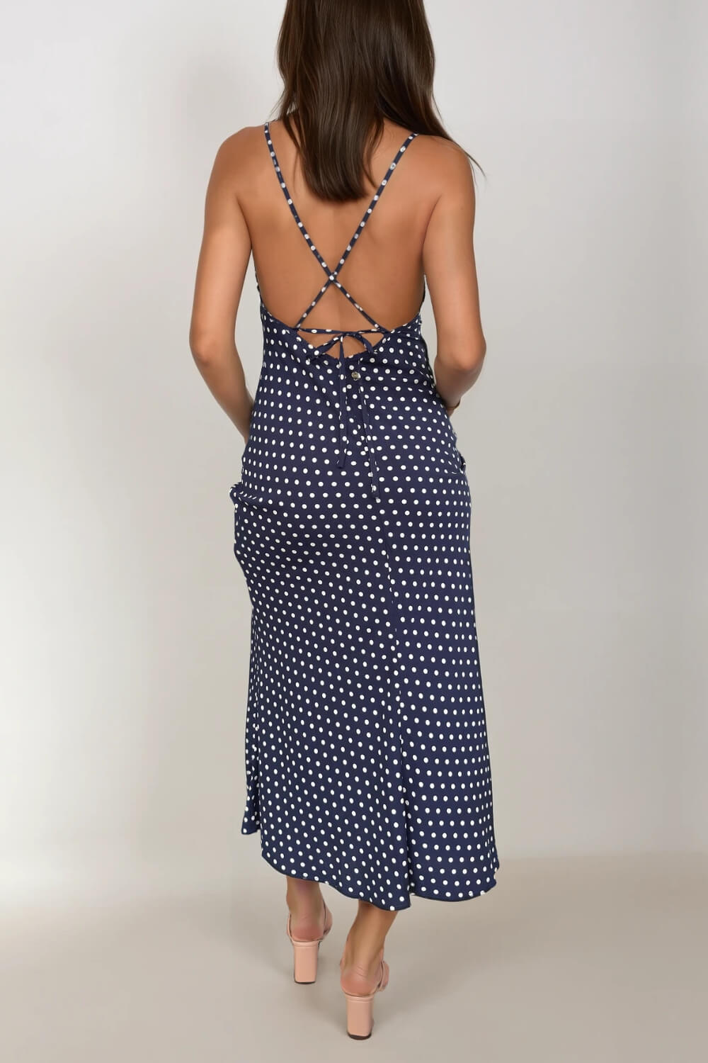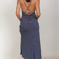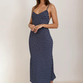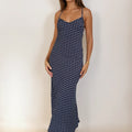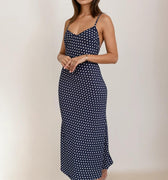 Este vestido es de esos que te hacen sentir cómoda y estilosa desde el primer momento. Confeccionado en 100% viscosa, tiene una caída suave y un movimiento precioso, ideal para quienes buscan frescura y un calce ligero. Su estampado de lunares blancos sobre fondo azul le da un toque clásico y atemporal que funciona perfecto tanto en días veraniegos como en tardes de media estación. Es femenino, versátil y alegre, pero sin perder elegancia. El diseño tipo slip dress alarga visualmente la figura gracias a su silueta fluida y su escote delicado en la parte delantera. La espalda es un detalle que conquista: breteles finos cruzados y ajustables, pensados para que puedas adaptarlo a tu medida y lograr un calce perfecto. El ruedo con leve amplitud aporta movimiento y soltura, haciendo que cada paso se sienta liviano. Es una prenda súper versátil: úsalo con sandalias planas para un look relajado o combínalo con accesorios dorados y una chaqueta liviana para elevarlo en segundos. Un vestido imprescindible si te encantan las prendas cómodas, femeninas y de estilo más atemporal.