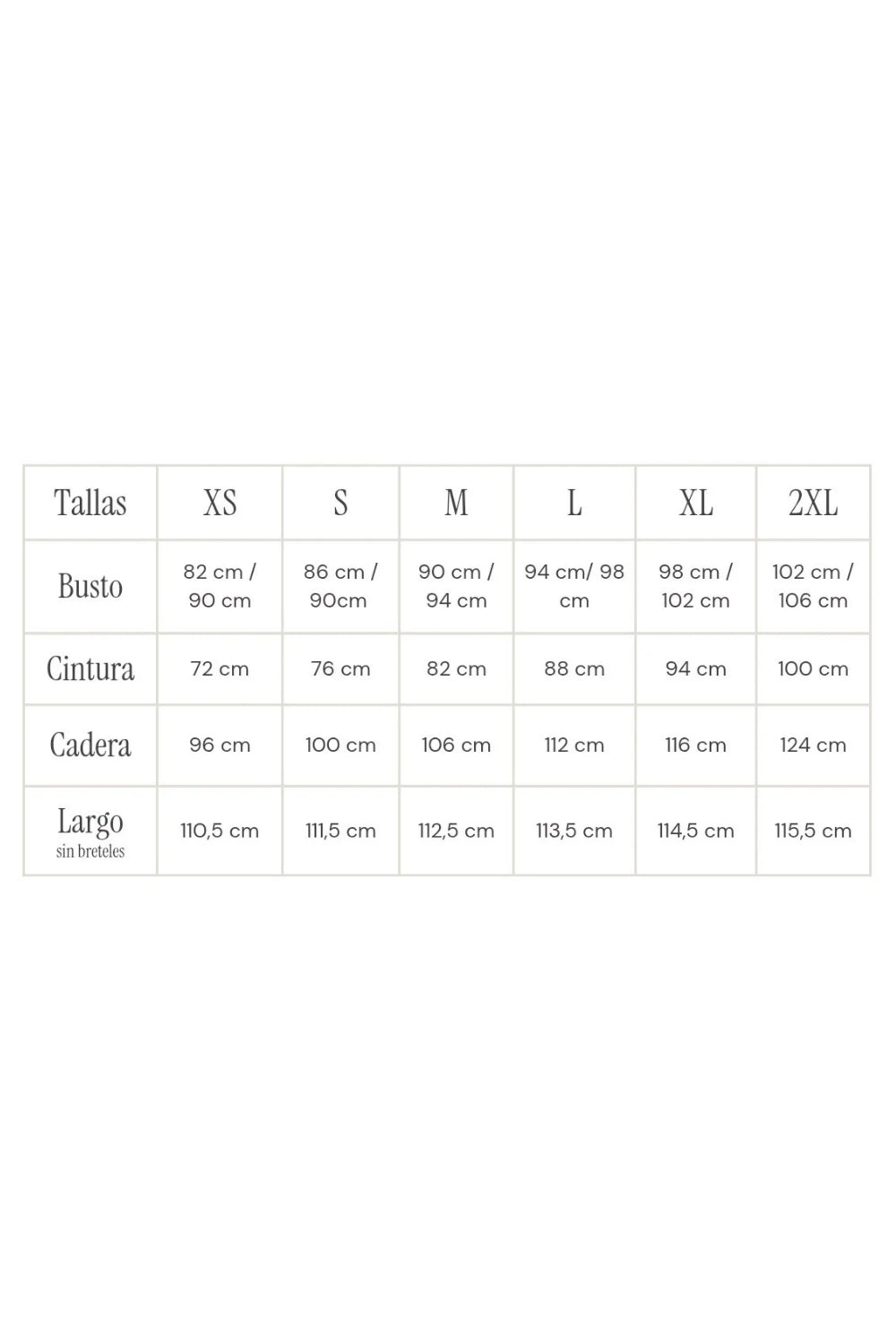 ✨ Consejo para elegir tu talla: Este vestido se adapta a la silueta. Te aconsejamos que te guíes por las medidas de cintura que es la parte más "entallada" de la prenda. Ten en cuenta que al ser espalda descubierta, la medida en la tabla solo considera el frente de busto, no el contorno completo. Nuestras tallas son más amplias de lo normal, ya que la idea es que las prendas sean cómodas y sueltas.