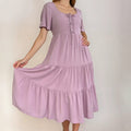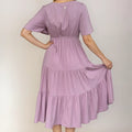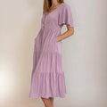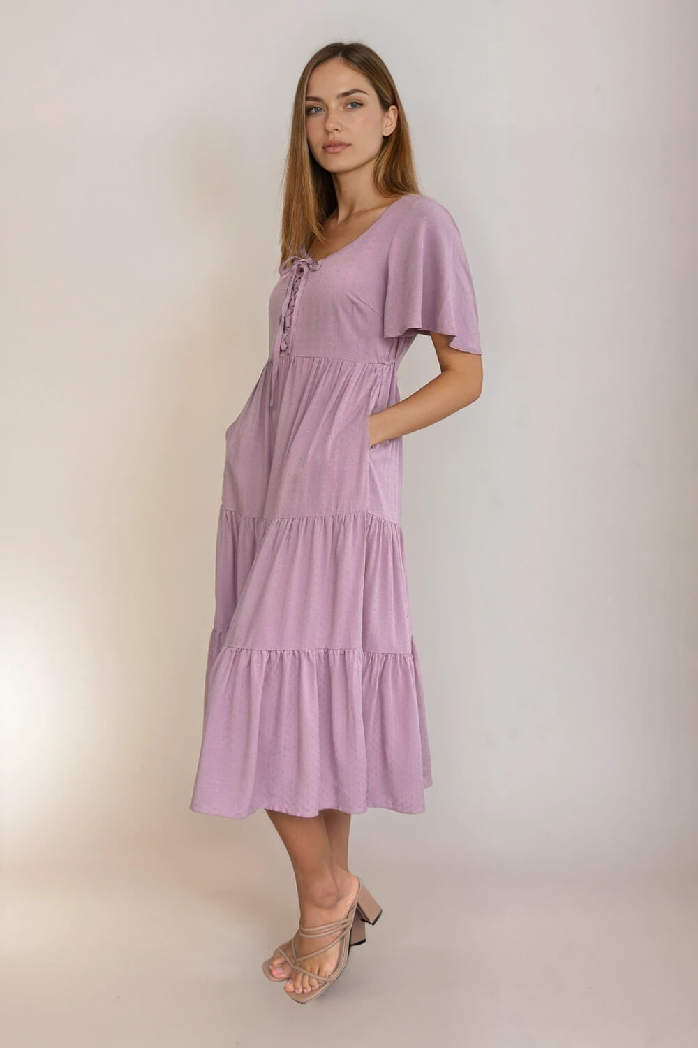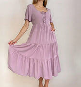 Su diseño destaca por un escote con lazos entrecruzados, que permiten ajustarlo sutilmente según prefieras, aportando un toque romántico y muy favorecedor. Las mangas cortas sueltas dan libertad de movimiento y suman frescura, haciéndolo perfecto para primavera, verano y esos días templados de media estación. La cintura elasticada cae suavemente bajo el busto, dando paso a una falda amplia con capas que generan vuelo, logrando ese efecto etéreo que estiliza y le aporta dinamismo a cada paso. Y como varios de nuestros vestidos, cuenta con bolsillos laterales, discretos pero muy prácticos para llevar lo esencial sin perder comodidad.
